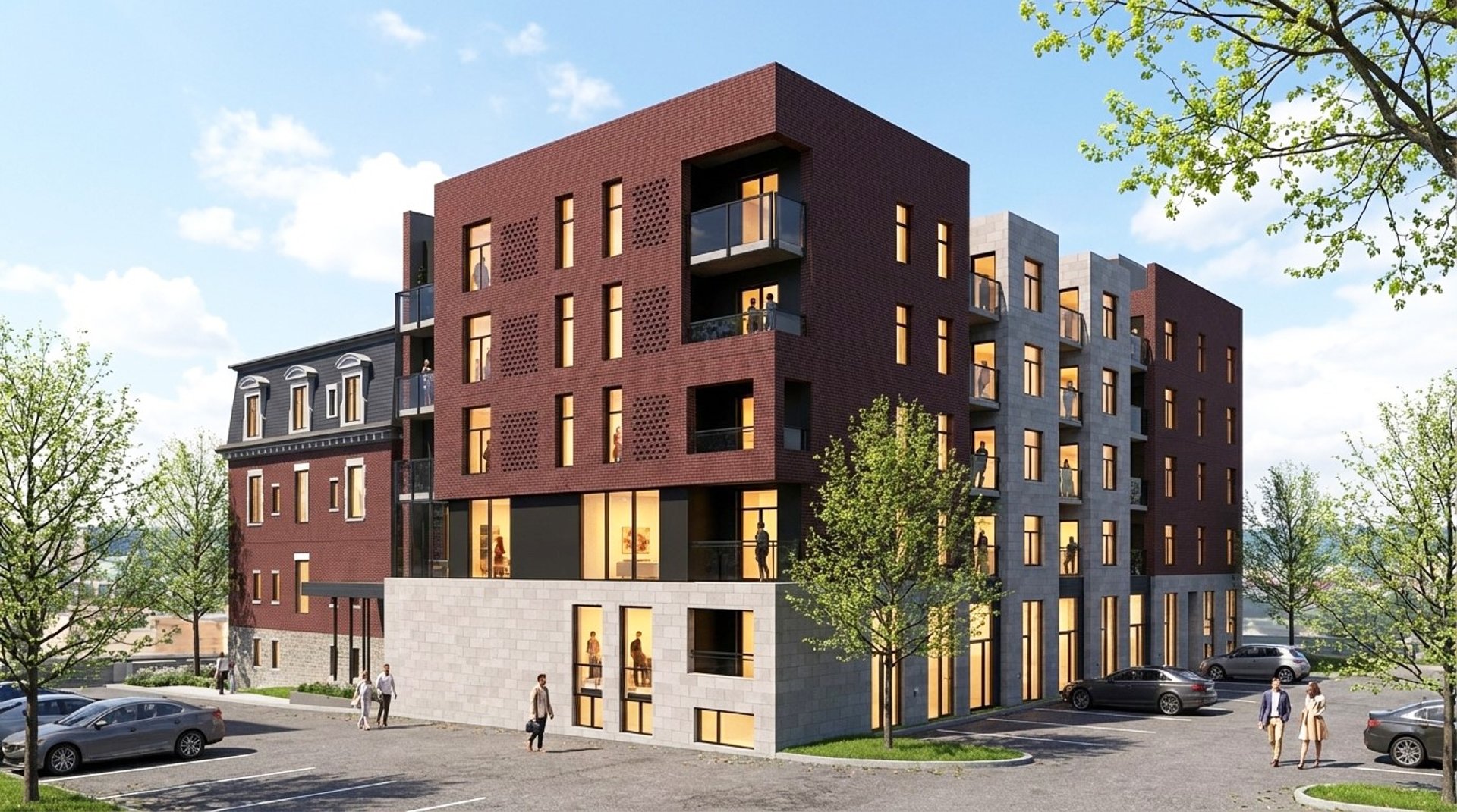 Four-storey mixed-use development near Mont-Saint-Hilaire , 60 residential units with ground-floor office space.