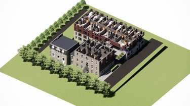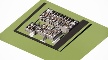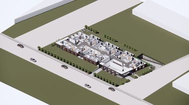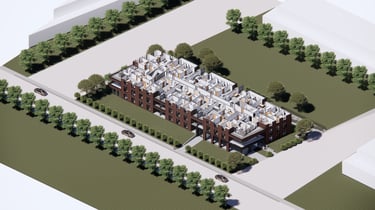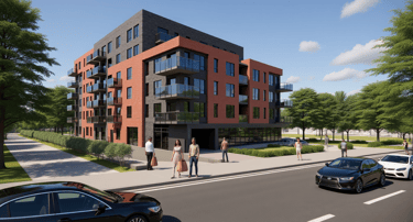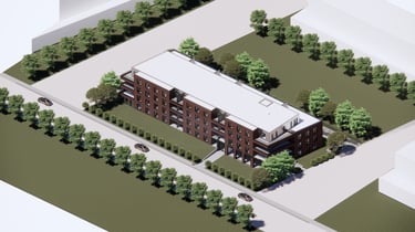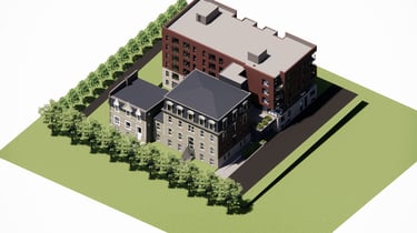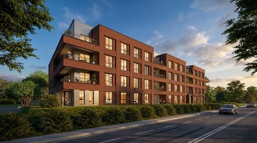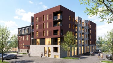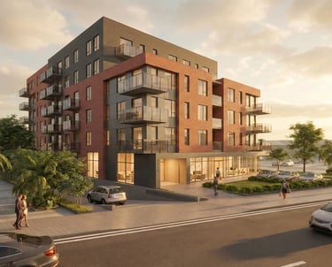Located in a developing area near Mont-Saint-Hilaire, this mixed-use project consists of a four-storey residential complex with 60 units and an office space at ground level. The architectural concept is articulated through three brick volumes, unified by continuous horizontal balcony bands that emphasize rhythm and cohesion. The project is carefully scaled to respect the typology and residential character of the surrounding neighborhood, creating a balanced transition between density and context.