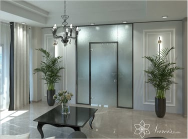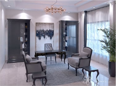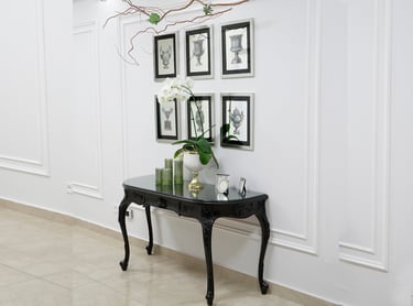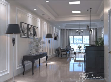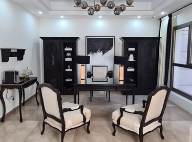 The client requested a neo-classic aesthetic with a bold black palette. To achieve this, we introduced wall moldings that bring a refined, classic atmosphere, paired with black furniture to create high contrast and visual depth. The result is a sophisticated, welcoming environment that balances timeless elegance with modern functionality.