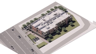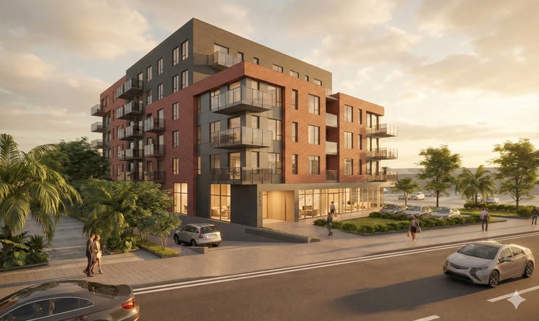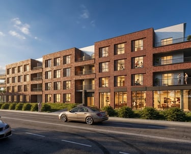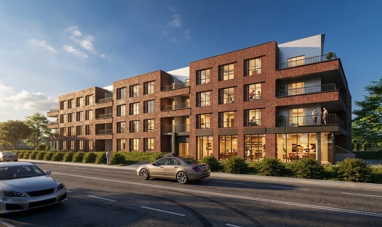 A six-storey mixed-use building designed with clarity and balance. The ground floor opens to the neighborhood with transparent commercial spaces, while 55 residential units above offer calm, well-planned living from one- to three-bedroom layouts, each with indoor parking. The architectural expression is defined by balance and rhythm: a symmetrical main elevation composed of warm red brick and dark grey metal with a fully glazed first level subtly separating public and private uses.