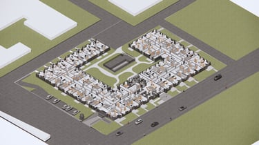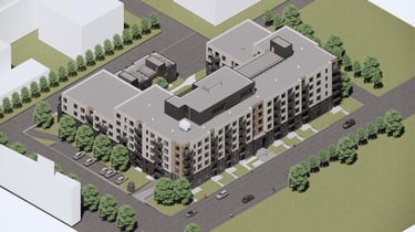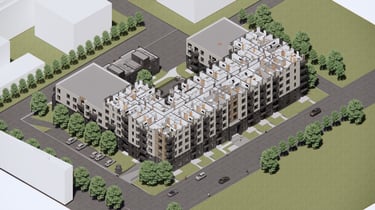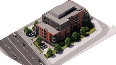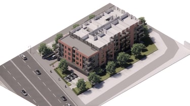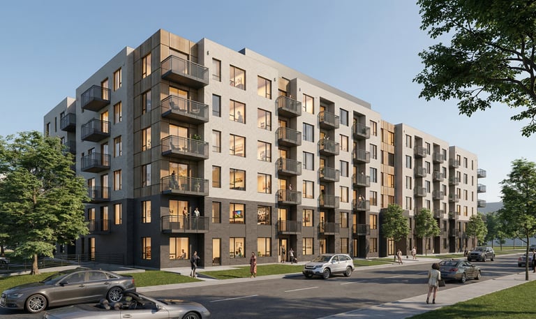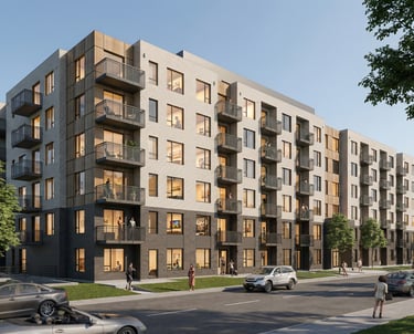 The first phase of a large-scale residential development shaping a new urban fabric in Drummondville. This six-storey building introduces 155 units, from studios to three-bedroom residences, designed for flexibility and everyday living. At the rear, seven duplex townhouses provide a more intimate scale, each with two dedicated parking spaces. The façade blends light and dark brick, with darker tones anchoring the first two levels to create a strong podium and a clear architectural base for the phases to follow.