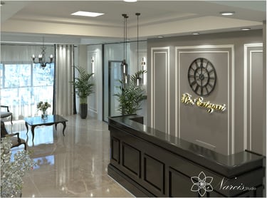 While the client preferred his brand color—navy bluewe introduced a soft, feminine color palette to appeal to the majority female clientele. Large sofas and comfortable chairs were incorporated to create a cozy, welcoming atmosphere, balancing functionality with warmth and elegance.