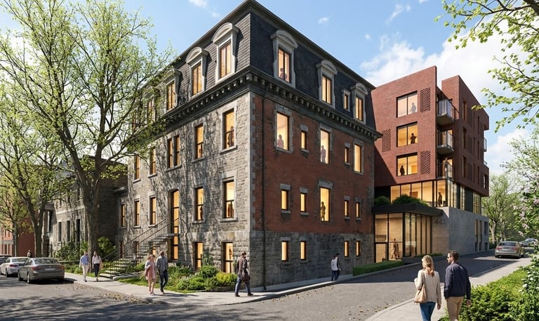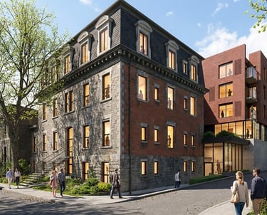 Located within a sector of recognized heritage value, the 429–441 rue de la Gauchetière project balances preservation and contemporary intervention. Historic façades are carefully restored while a new residential extension is introduced without competing with the site’s heritage character. Situated near the CHUM hospital, the project provides housing for students, interns, and medical professionals, with the new volume oriented toward rue Bernadette through a transparent transition and complementary materials that ensure architectural continuity, urban quality, and long-term durability.